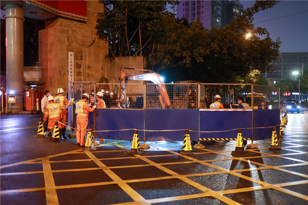 排水公司立即啟動應急預案,市住建局副局長吳智、公司副總經理程樂坐鎮(zhèn)指揮,運維分公司經理韋雄飛及有關負責人立即趕赴現(xiàn)場排查,核實為消防支隊用戶管破損,水流沖刷土體導致路面塌陷。當天20時,塌陷處完成圍擋,21時所有人員、車輛和設備全部到位,立即投入緊張地搶修。